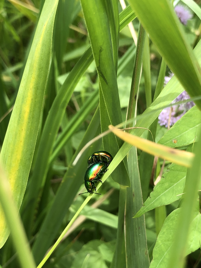 Tansy beetles found near clumps of water mint at Woodwalton Fen. The beetles were much easier to spot in the sun as they caught the light. You can see why the Victorians used their wing cases as sequins!
