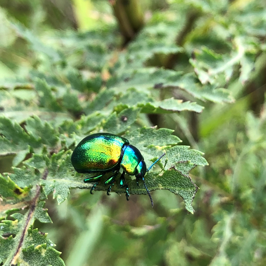 Tansy beetles found near clumps of water mint at Woodwalton Fen. The beetles were much easier to spot in the sun as they caught the light. You can see why the Victorians used their wing cases as sequins!
